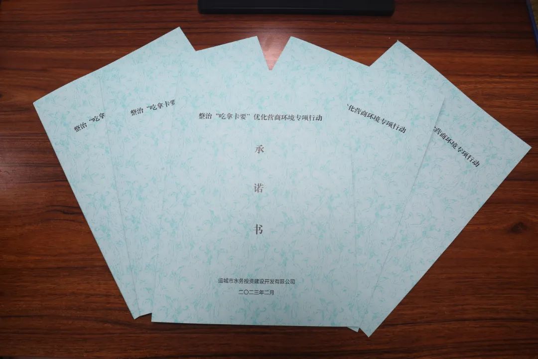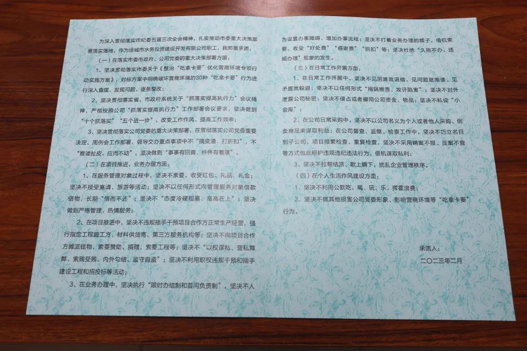 最后,黨委委員、紀委書記王望寬帶領(lǐng)全體參會人員進行整治“吃拿卡要”優(yōu)化營商環(huán)境專項行動集體承諾并簽訂《承諾書》。