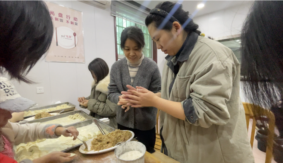 大家一起圍在桌旁,分工有序、忙而不亂,互相交流著包餃子的技巧,歡聲笑語中各個(gè)大顯身手,現(xiàn)場氣氛和諧,到處洋溢著“家”的味道、“家”的溫馨。一番協(xié)作之下,一排排個(gè)性十足的餃子很快就包好了,屋外寒風(fēng)陣陣,屋內(nèi)歡聲笑語,暖意融融。