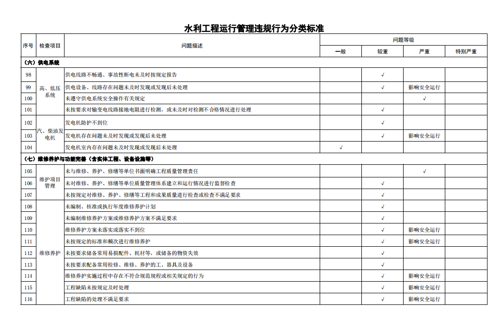 第六條 水利工程運(yùn)行管理問題包括運(yùn)行管理違規(guī)行為和工程缺陷。