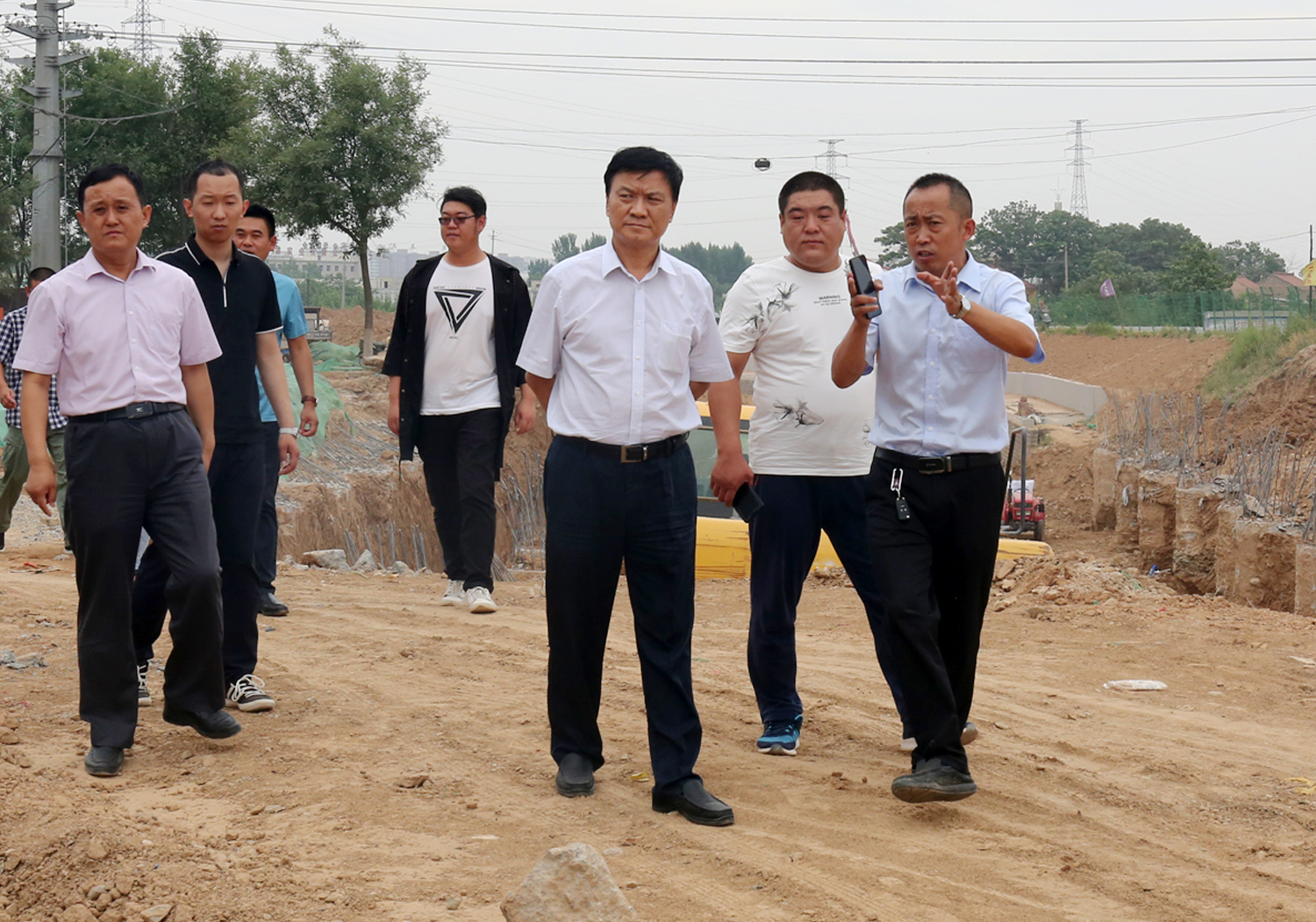 在施工現(xiàn)場,崔作銘董事長現(xiàn)場聽取了項目部負(fù)責(zé)人對工程中存在問題和建設(shè)進(jìn)度的匯報。查看了建華廠和左岸凰城段施工現(xiàn)場。針對施工中存在的無施工便道和進(jìn)度慢的問題,他要求:一、建華廠段渠道施工,利用209國道護(hù)欄,將渠道和國道緊密結(jié)合,加快施工;二、左岸凰城段施工中無道路可行,以渠道做施工道路,輪替施工,橋梁施工加快速度,盡快實現(xiàn)通車;三、項目部要加班加點(diǎn),加快建設(shè),力爭6月底完成渠道主體工程。